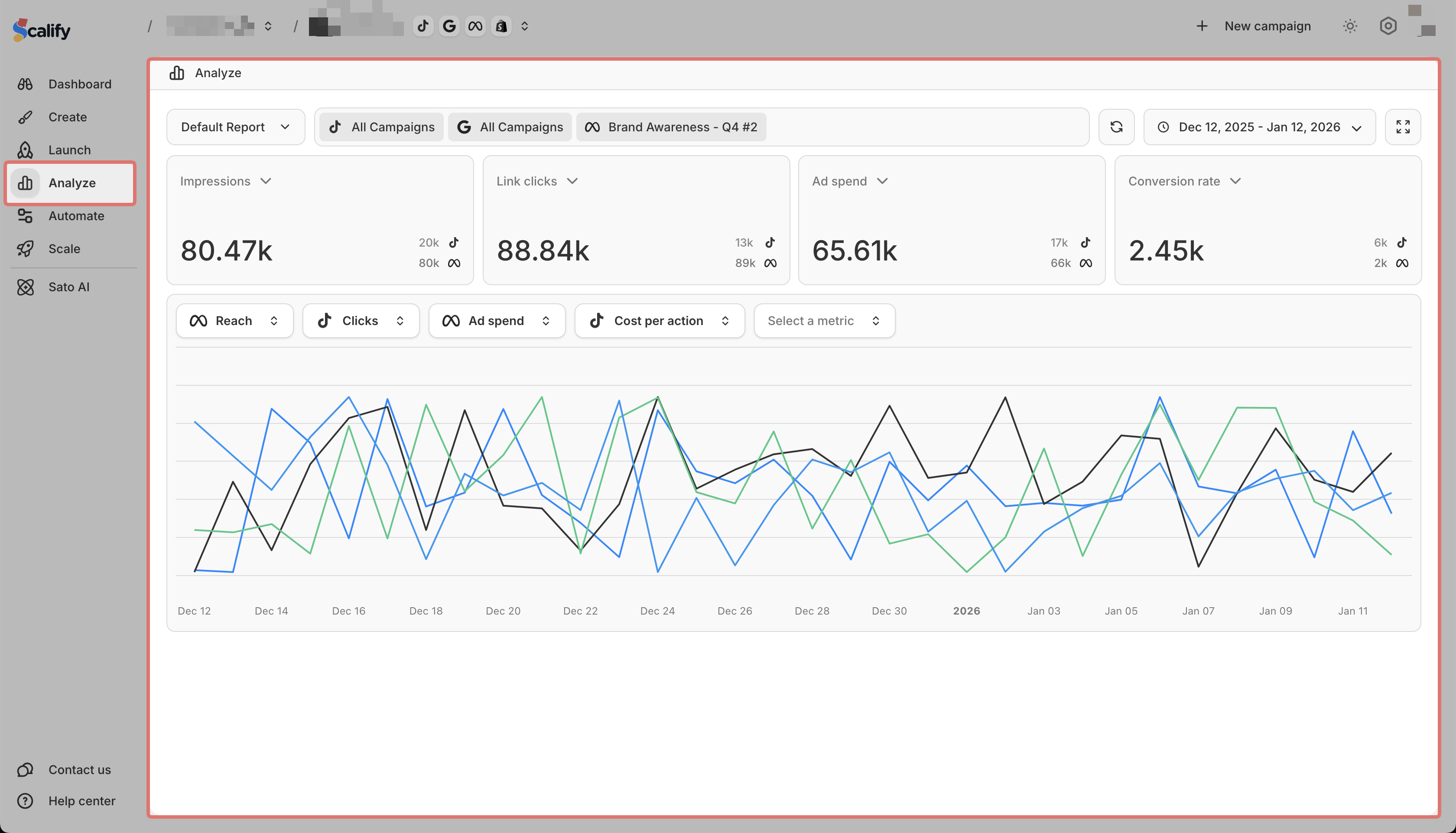 Displays data from one platform at a time (Meta or TikTok)