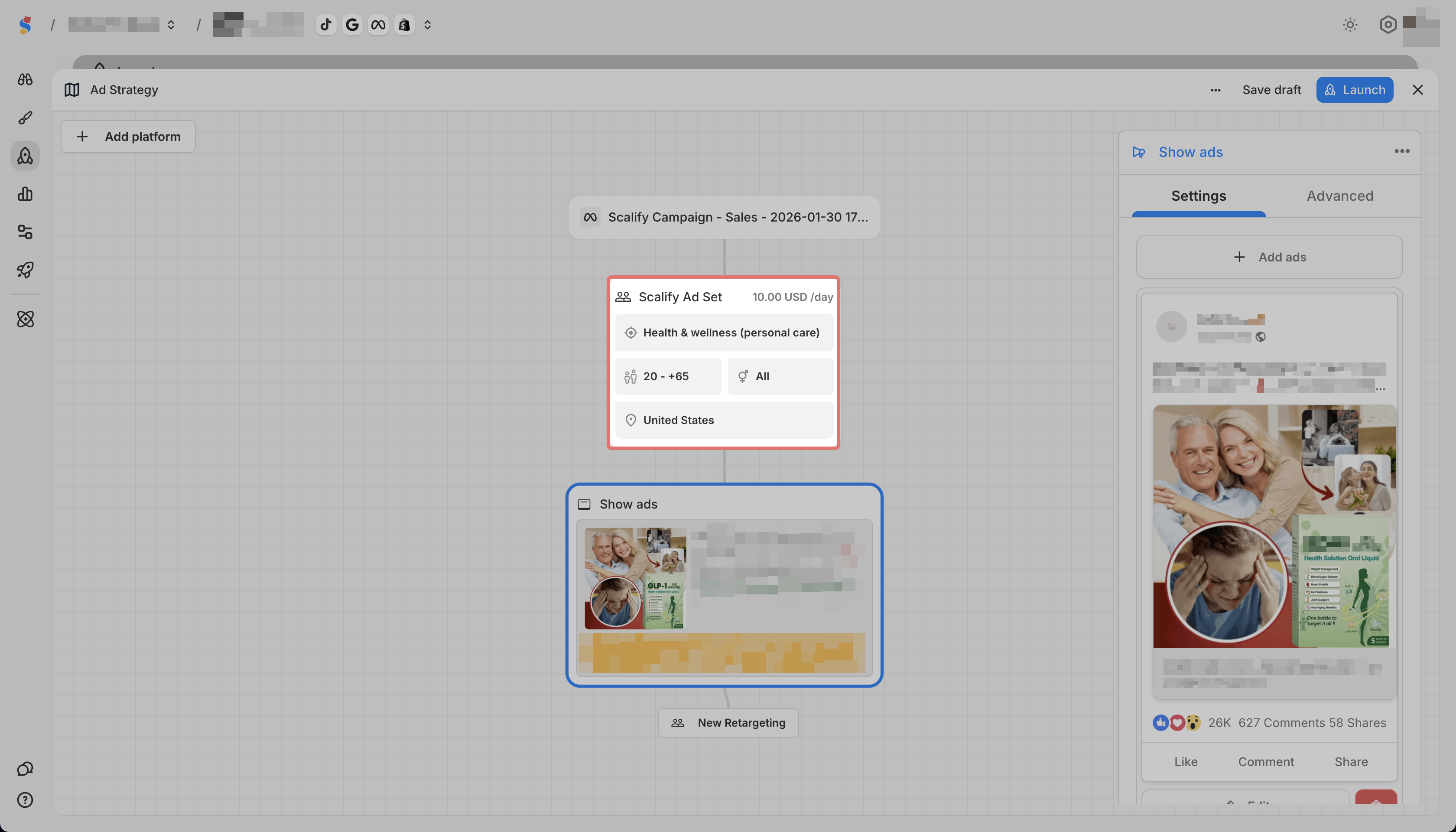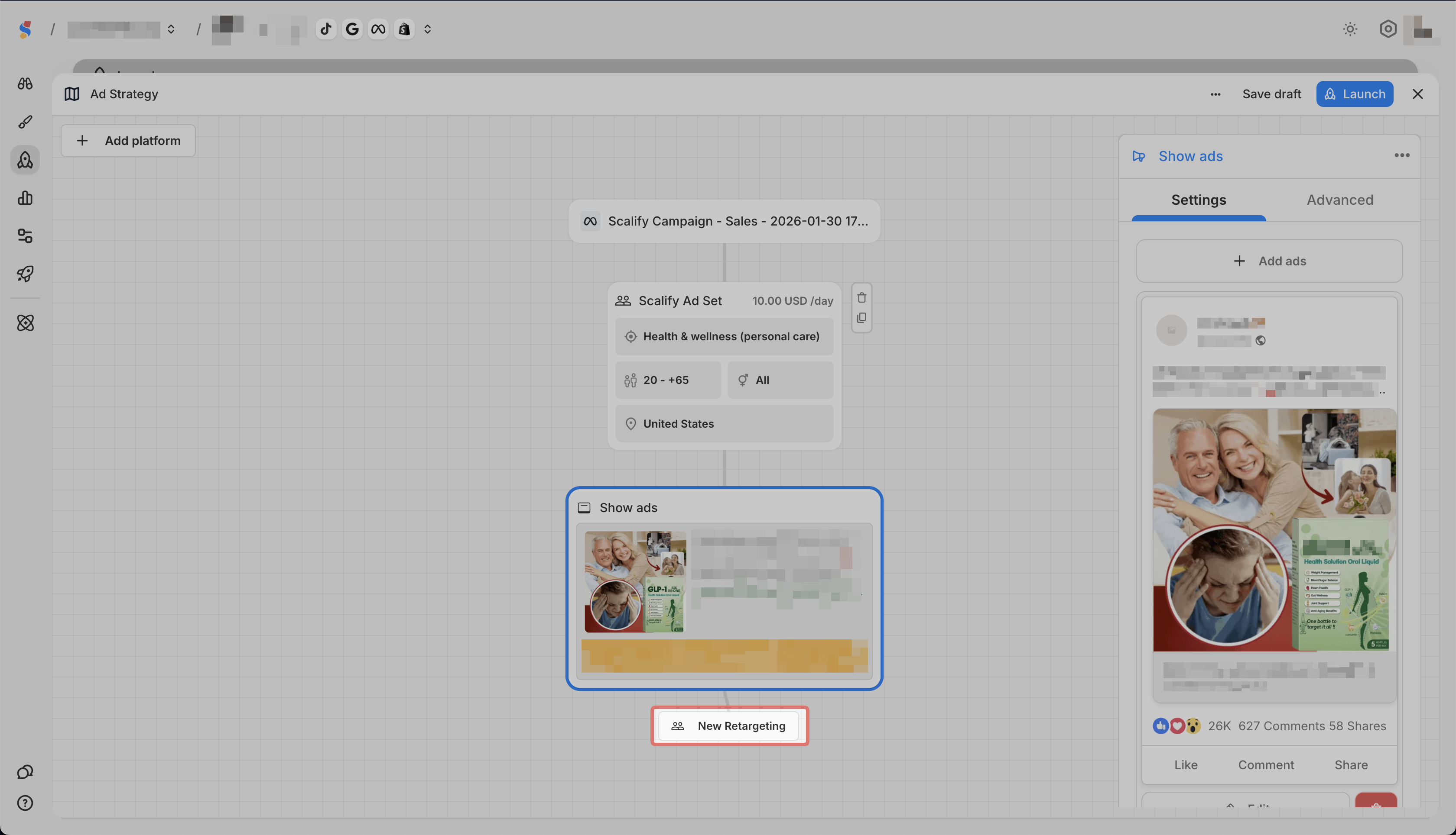 The Launch builder lets you create a complete advertising funnel in one view.