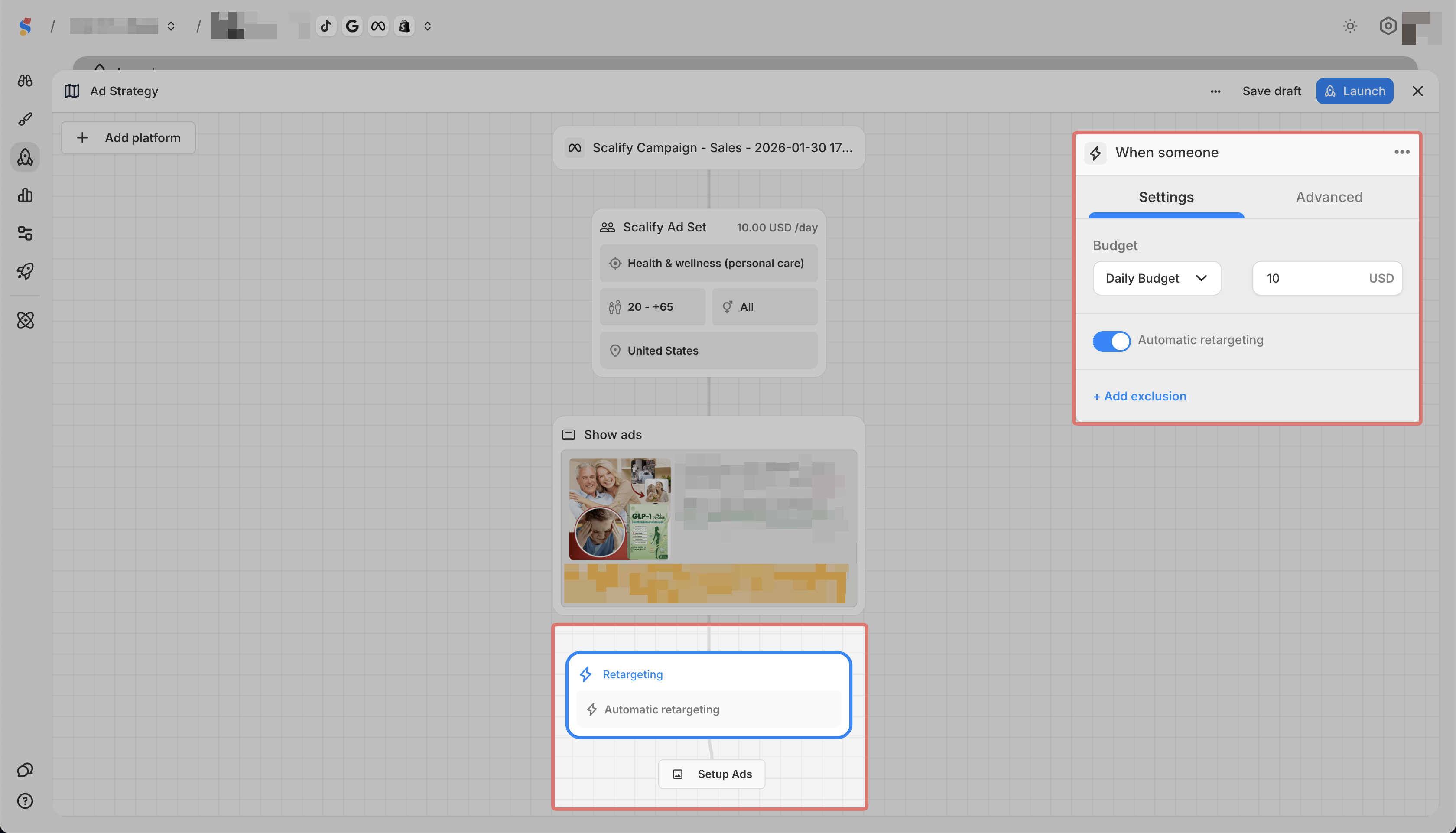 Below it, add a Retargeting block to target people who engaged